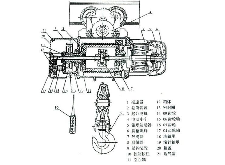 CD1型鋼絲繩電動(dòng)葫蘆組成的部分大致可分為:減速器、控制箱、鋼絲繩、錐形電動(dòng)機(jī)、按鈕開(kāi)關(guān)。