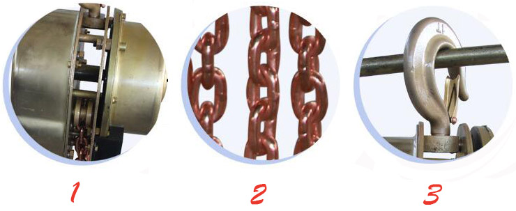 2、手拉鏈條采用H62黃銅材質,起重鏈條采用20Mn2鋼鏈條鍍鎳銅合金材料,鏈條摩擦不會引起火花發生爆炸等不良反應。