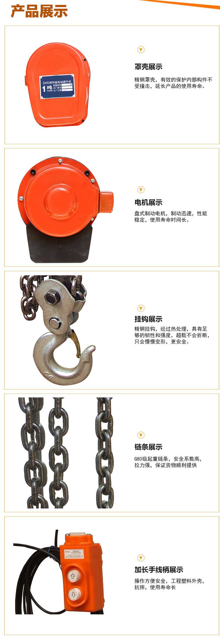 5、極限開關(guān):吊上吊下都有極限快關(guān)裝置,使電機自動停止,反防止鏈條超出,確保安全。