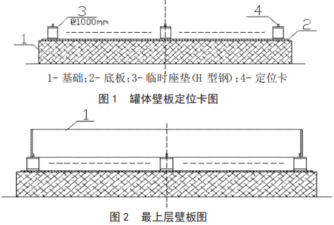1、儲罐底板組焊完成后,在儲罐壁板位置,每隔1-1.5m點焊H型鋼作為罐體臨時座墊(便于進入儲罐施工,亦利于后期清潔施工環(huán)境衛(wèi)生),H型鋼上表面焊接壁板的定位卡(見圖1)。