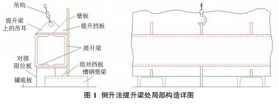 發布日期:2022-07-02 10:26:02 訪問量:1313往常施工時,將提升吊耳直接焊接在壁板上,該方式常導致吊耳處壁板拉應力過大而變形。本項目采用設置提升梁焊接吊耳的方法。即在壁板下部設置由兩根槽鋼對扣而成的提升梁,兩側按間距1m加墜板焊接而成,提升梁卷弧成外緣與罐體內徑相同的弧形。提升梁分成數段,每節提升梁對應安裝2根提升立柱。在提升梁的綴板上焊接壁板對接的限位鋼擋板。提升梁上的吊耳焊接在提升立柱的正下方。在吊耳兩側各1m長度內的提升梁增設綴板加強。提升梁采用龍門卡具連接儲罐壁板。龍門卡具設置位置不宜距吊耳太近,以免壁板受拉變形,距離太遠則易使提升梁扭曲變形。提升梁處局部構造見圖1所示。