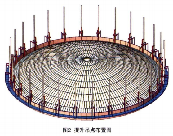 發(fā)布日期:2023-03-07 10:41:42 訪問量:899煤氣柜柜頂提升:煤氣柜柜頂整體提升吊點設置在28等分的邊環(huán)梁上,共計28個吊點(見圖2)。采用28個電動葫蘆整體提升柜頂、外部掛架及掛柱,提升高度達到要求后使掛柱鉤在支撐牛腿上部,內部施工人員在柜頂板上面,同時外部作業(yè)人員在掛架上面安裝焊接側板,依次共進行49次提升②,最后一次柜頂邊環(huán)梁連接鋼柱后拆除用來提升使用的構件及加長的鋼柱。