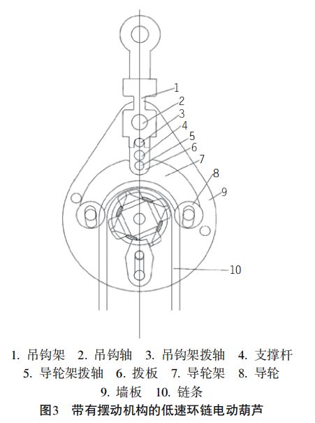 發(fā)布日期:2023-08-10 10:51:53 訪問量:2770帶有擺動機(jī)構(gòu)的單鏈條葫蘆,可以有效解決葫蘆體受力不平衡、扭鏈、卡鏈、脫鏈、結(jié)構(gòu)不緊湊、運輸安裝不方便等弊端,結(jié)構(gòu)如圖3所示。